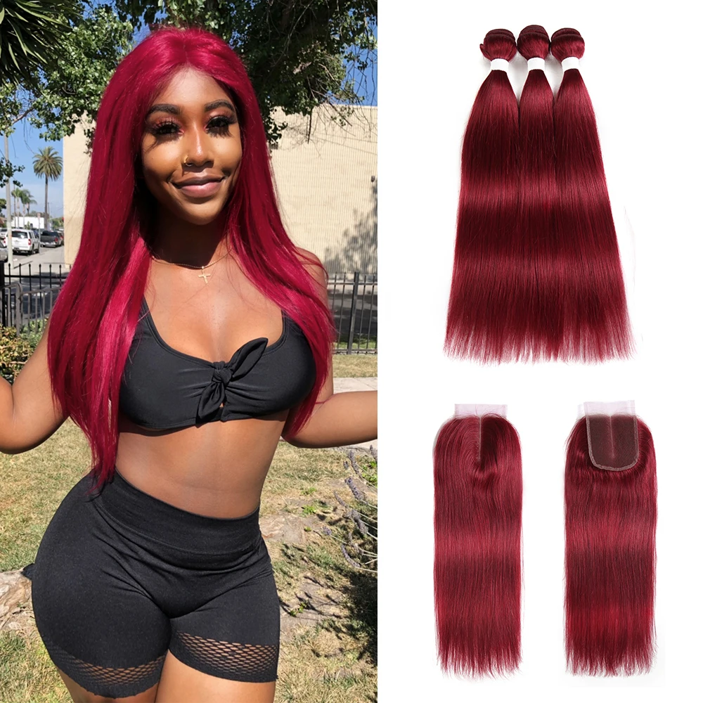 Special Offer 99J Burgund Menschliches Haar Bundles Mit Verschluss 4x4 Rot Brasilianisches Gerade Haarwebart Bundles Mit Verschluss nicht Remy Haar KEMY Discount 51% Today!